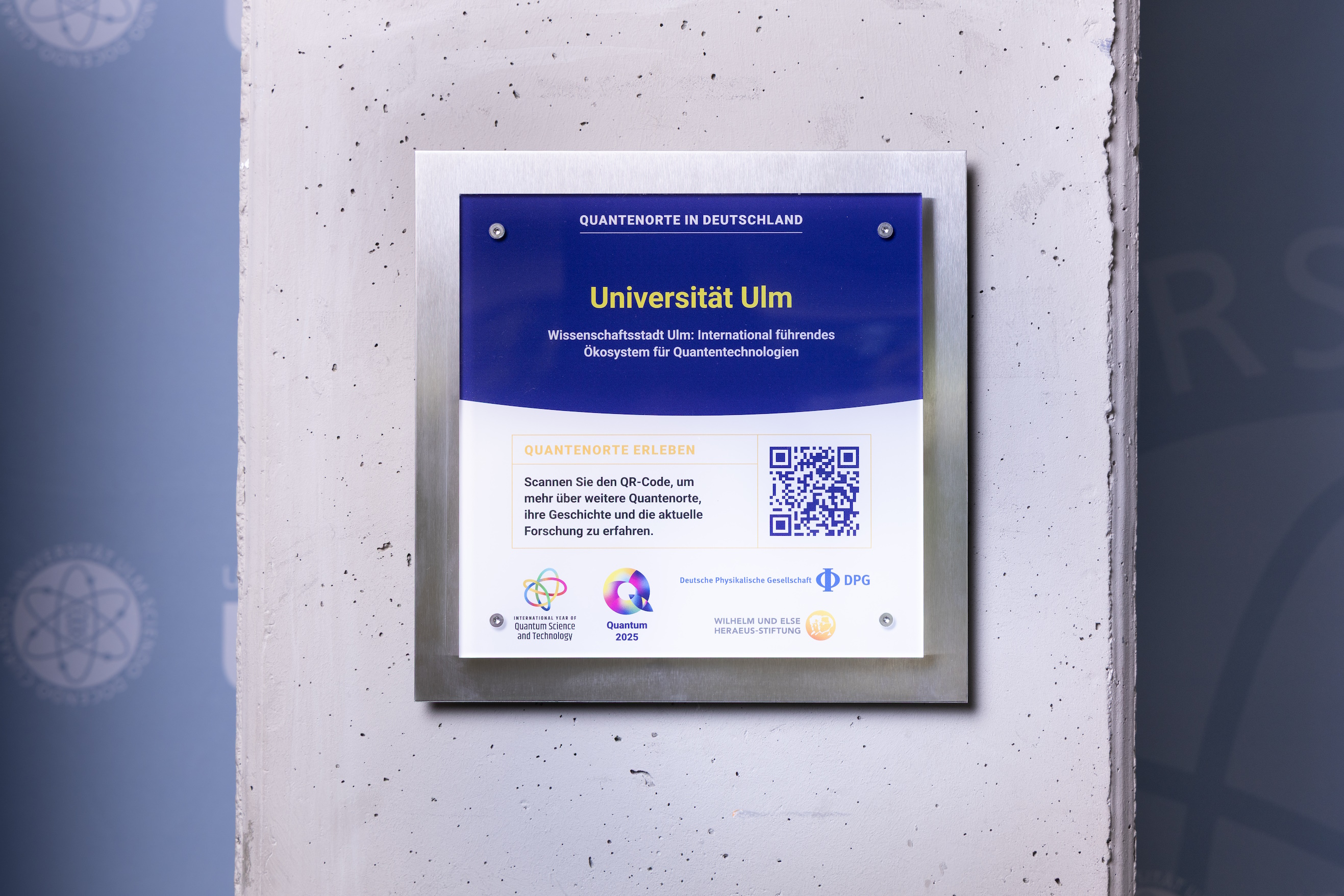 Anlässlich des Internationalen Jahres der Quantenwissenschaft und -technologie hat die Deutsche Physikalische Gesellschaft die Aktion „100 Quantenorte – Inkubatoren der Quantenforschung“ ins Leben gerufen. Am 12. Mai 2025 hat die DPG die Universität Ulm und der Standort Ulm des Deutschen Zentrums für Luft- und Raumfahrt (DLR) feierlich als erste Quantenorte ausgezeichnet. „In der Geburtsstadt Albert Einsteins forscht die Universität Ulm von den Grundlagen bis hin zu konkreten Anwendungen wie Quanten-Navigation, -Sensorik, -Kommunikation und -Computing. Dabei arbeitet sie im engen Verbund mit dem Standort Ulm des Deutschen Zentrums für Luft- und Raumfahrt (DLR) zusammen. Dies würdigt die Deutsche Physikalische Gesellschaft mit der Auszeichnung der beiden Institutionen als erste Quantenorte in Deutschland.“, erläutert Claus Lämmerzahl, DPG-Vorstandsmitglied für Öffentlichkeitsarbeit. Die Quantenorte erhielten jeweils eine Gebäudeplakette, die gut sichtbar vor Ort angebracht wurden. Die Plaketten enthalten einen QR-Code, der auf die interaktive online-Karte aller Quantenorte verweist.