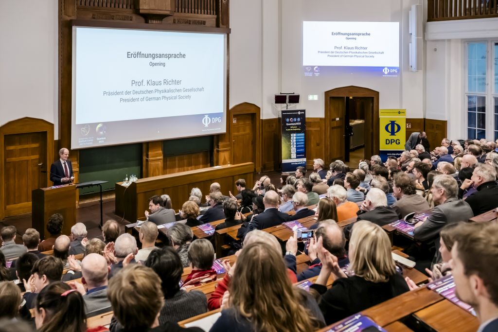 Im Mittelpunkt stand in diesem Jahr das International Year of Quantum Science and Technology 2025. Die DPG übernahm in Deutschland die Federführung und setzte mit dem Programm Quantum2025 zahlreiche Akzente. Im Anschluss an die feierliche Auftaktveranstaltung im Januar an der Humboldt-Universität zu Berlin wurden vielfältige öffentliche Formate für Schulen, Studierende, Forschende und Interessierte realisiert. Darunter viele bundesweite Aktivitäten, die die Bedeutung der Quantenphysik für Wissenschaft, Technologie und Gesellschaft sichtbar machten. Außerdem fand die 2. DPG-Herbsttagung in Göttingen zu den Themen moderne Entwicklungen der Quantenforschung bis hin zur historischen Bedeutung der Quantenmechanik statt. Beendet wurde das Quantenjahr in Deutschland mit einer fulminanten Abschlussfeier mit Konzert in der Halle Münsterland.