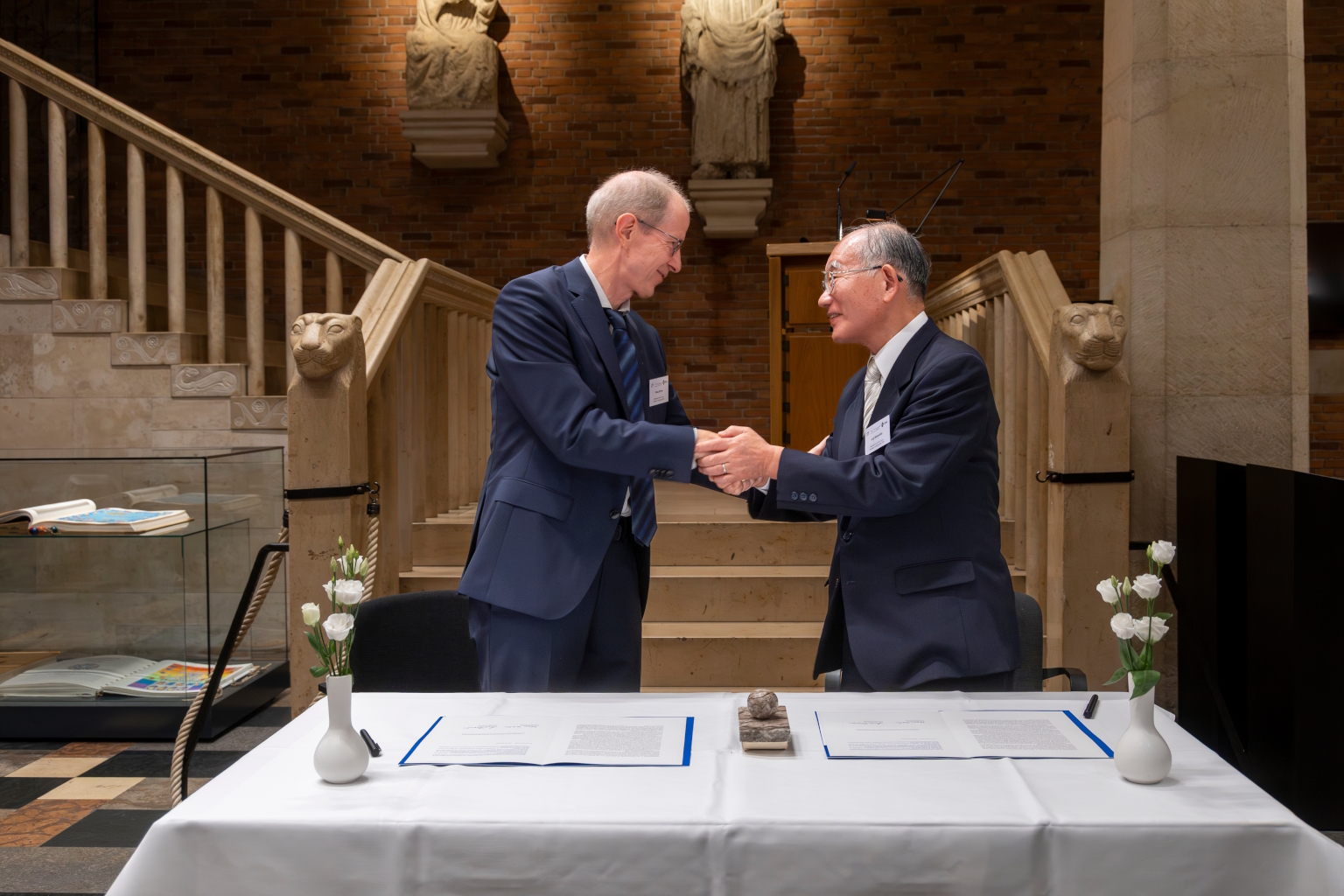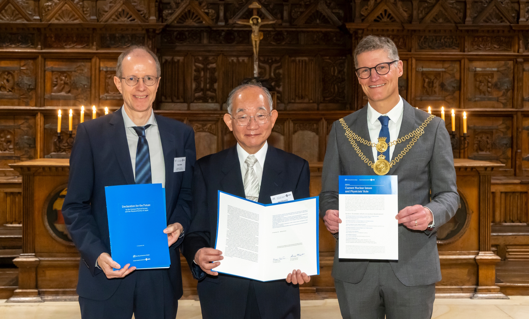 Am 14. November 2025 haben DPG-Präsident Klaus Richter und sein Amtskollege von der Physikalischen Gesellschaft von Japan, Seiji Miyashita, im historischen Friedenssaal des Münsteraner Rathauses eine gemeinsame „Erklärung für die Zukunft“ unterzeichnet. Mit dieser Erklärung sprechen beide Gesellschaften eine eindringliche Warnung vor den Gefahren aus, die von Atomwaffen – gleich welcher Art – ausgehen. Zugleich verweisen sie auf die Risiken, die bereits durch jede Form atomarer Aufrüstung entstehen.