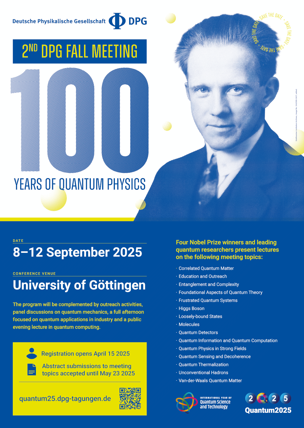 Göttingen spielte vor 100 Jahren eine zentrale Rolle in der Entstehung der Quantenmechanik – insbesondere mit Heisenbergs bahnbrechender Arbeit von 1925. Die 2. DPG-Herbsttagung würdigt dieses Erbe und reflektiert zugleich aktuelle und zukünftige Entwicklungen in der Quantenphysik. „Die diesjährige DPG-Herbsttagung spiegelt die beeindruckende inhaltliche Bandbreite der modernen Quantenphysik wider – von ultrakalten Quantengasen und Festkörpern bis hin zu astrophysikalischen Fragestellungen, Quantencomputing und gesellschaftlichen Implikationen. Diese Vielfalt zeigt nicht nur die Tiefe der Grundlagenforschung, sondern auch die wachsende Relevanz quantenbasierter Technologien für andere Disziplinen und Anwendungen im Alltag“, fasst Klaus Richter, Präsident der DPG, zusammen.