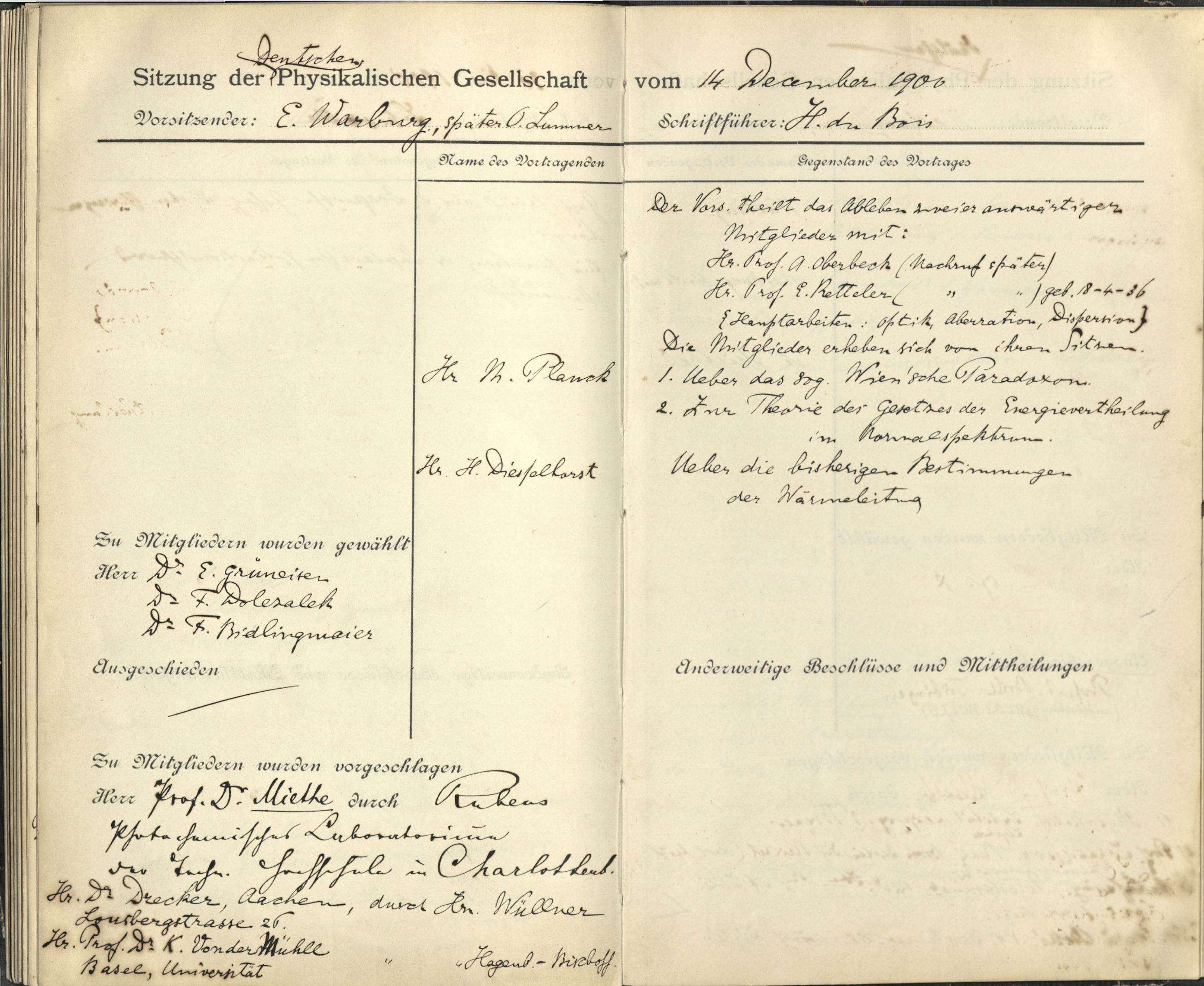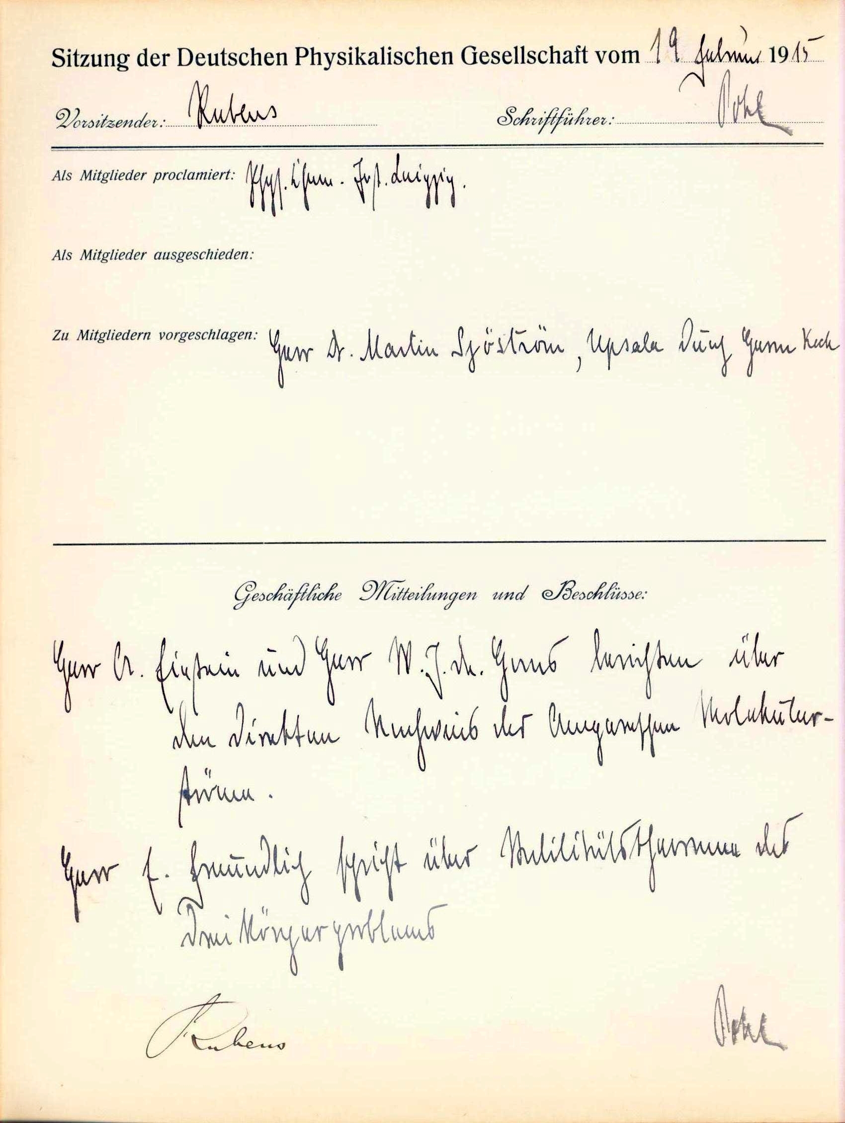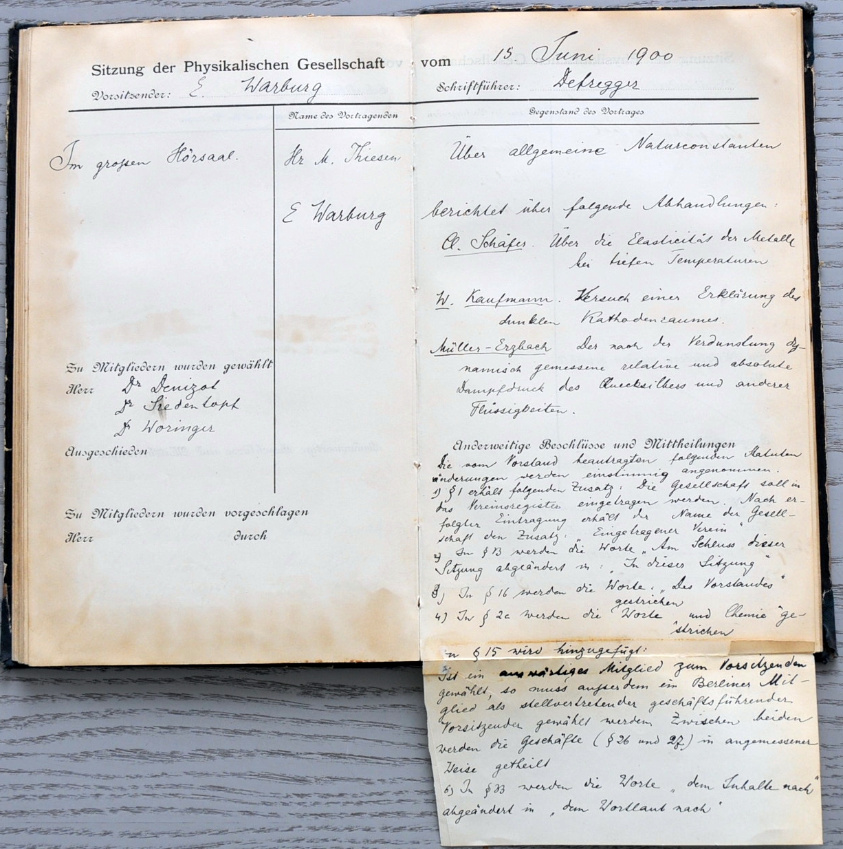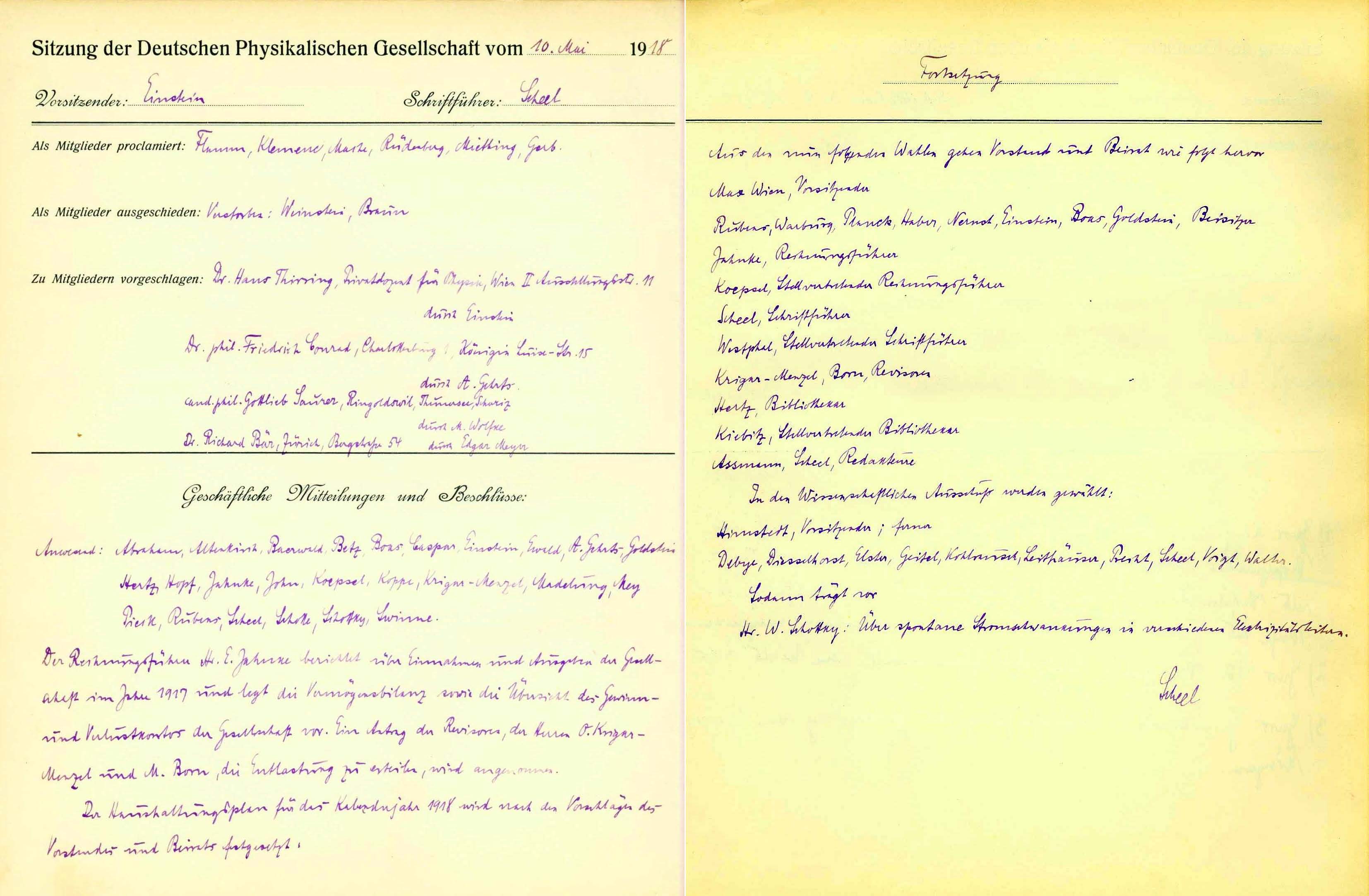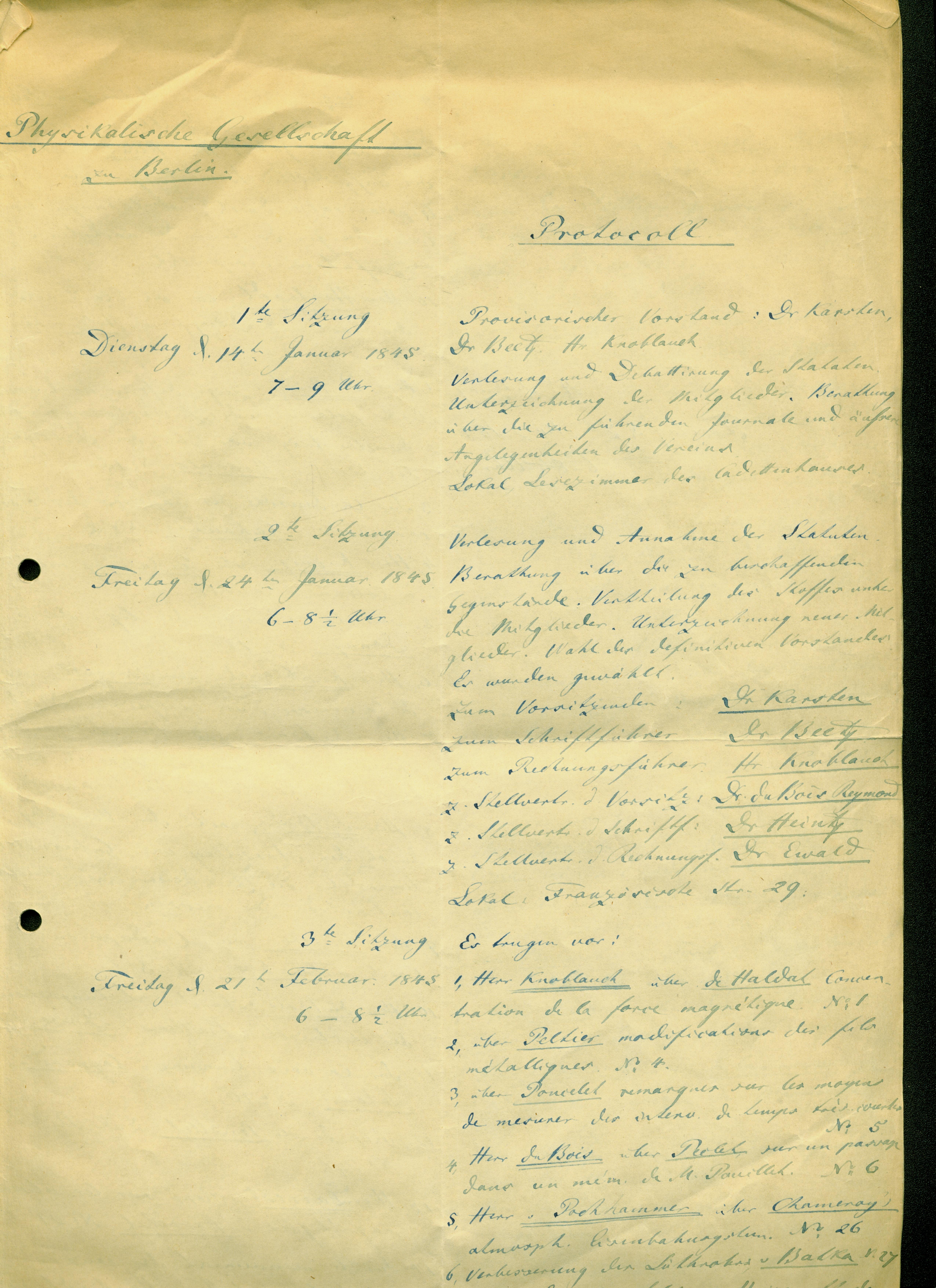 Das älteste erhaltene Dokument ist das Protokoll der Gründungsversammlung vom 14. Januar 1845. Aus dem 19. Jahrhundert sind allerdings nur einige Protokollbücher der ursprünglich 14-tägig stattfindenden Sitzungen überliefert, und auch diese nicht vollständig. Ein wahrer Schatz ist das Protokollbuch der Jahre 1910 bis 1921, in dem sich viele handschriftliche Eintragungen bedeutender Physiker befinden.