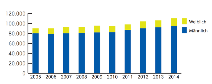 Physikerinnen und Physiker sind zufriedene und gesuchte Arbeitskräfte. Das zeigen Arbeitsmarktanalysen der Deutschen Physikalischen Gesellschaft (DPG). Dazu wertet die DPG regelmäßig Statistiken der Bundesagentur für Arbeit (BA) aus und führt umfangreiche Studien auf Basis von Daten aus dem Mikrozensus durch. In Deutschland gibt es rund 150.000 Physikerinnen und Physiker. Davon sind gut 110.000 erwerbstätig (Abb. 1), der Rest ist größtenteils im Ruhestand, arbeitsunfähig oder lebt als Privatier.