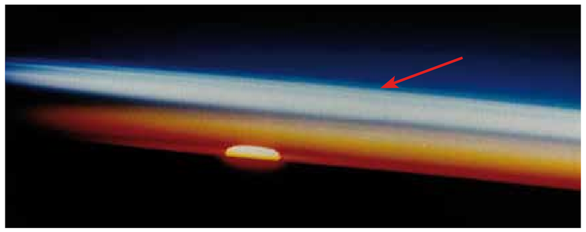 Die verstärkte „Junge Schicht“ (weiß) über der Troposphäre (orange) war nach dem Ausbruch des Vulkans Pinatubo vom Space-Shuttle aus deutlich zu erkennen. (Foto: NASA)