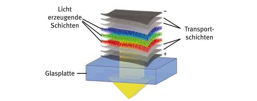 Elektrische Beleuchtung ist in der EU mit ca. 100 TWh1 /Jahr allein im privaten Bereich der drittgrößte Stromverbraucher [1]. Um den Verbrauch zu reduzieren, werden die unwirtschaftlichsten Leuchtmittel schrittweise verboten. Vor allem Glühbirnen sind sehr ineffizient – ihre Lichtausbeute liegt unter 15 lm/W (Verhältnis der optischen Leistung in Lumen zur elektrischen in Watt). Das entspricht weniger als 5 % der hineinfließenden Energie; der Rest wird in Wärme umgewandelt. Leuchtstoffröhren und Energiesparlampen erreichen höhere Werte, enthalten aber gesundheitsschädliches Quecksilber [2]. Noch effizienter sind anorganische und organische Leuchtdioden, in denen Licht nicht thermisch oder durch Gasentladung erzeugt wird, sondern direkt aus der Energie des Elektron-Loch-Paars im Halbleiter, d. h. durch Elektrolumineszenz. So kann theoretisch eine Effizienz von bis zu 100 % erreicht werden. Die besten kommerziellen LEDs liegen bei ca. 33 %, im Labor sind schon 70 – 80 % möglich.