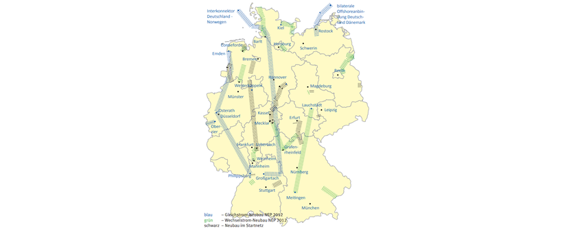 Eine weitere Schwierigkeit ergibt sich aus der regionalen Verteilung der Anlagen: Windkraftanlagen (WKA) werden vorwiegend in Gebieten mit optimalen Windstärken eingesetzt, d. h. an den Küsten und in Norddeutschland. In Süddeutschland sind die Windgeschwindigkeiten geringer und die Leistungen entsprechend kleiner3 . Deshalb finden wir im Norden Deutschlands eine Überkapazität an WKAs, während der große Energiebedarf in den Industriezentren im Süden besteht. Die im Süden installierten PV-Anlagen erzielen die beste Leistung überwiegend mittags im Sommer. Weiterhin entsprechen Zeiten hoher Stromproduktion oft nicht den Zeiten hohen Bedarfs. Da eine Speicherung der elektrischen Energie in dem benötigten Umfang z. Zt. nicht möglich ist [1], muss die überschüssige Windenergie von Nord nach Süd transportiert werden. Nach Berechnungen der Deutschen Energieagentur DENA [2] ist dazu der Bau von mindestens 3600 km an Höchstspannungsleitungen bis 2020 notwendig (Abb.1). Bisher wurden weniger als hundert Kilometer davon gebaut. Einige dieser Leitungen sind als Hochspannungs-Gleichstromleitungen vorgesehen, um die Windleistung gezielt, unabhängig vom Leistungsfluss im Verbundnetz, transportieren zu können.