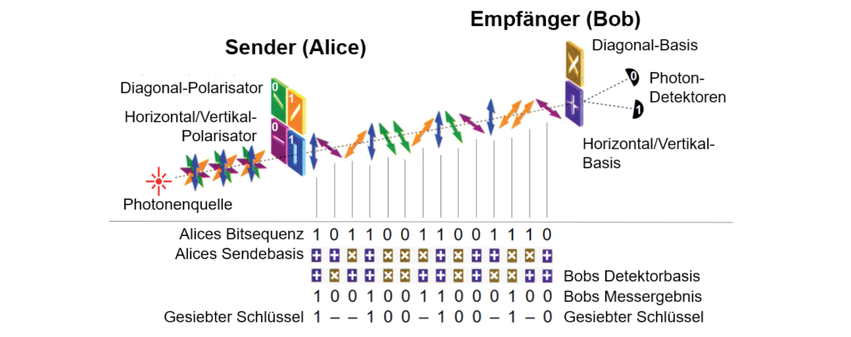 Unsere elektronische Kommunikation soll nicht an falsche Ohren gelangen, dafür verlassen wir uns auf deren abhörsichere Übertragung. Diese beruht derzeit auf mathematischen Verschlüsselungsalgorithmen, welche zwar schwierig, aber nicht unmöglich zu knacken sind, insbesondere wenn dem Lauscher ein Quantencomputer zur Verfügung stünde [1]. Diese Bedenken gibt es nicht, wenn die sensible Information mittels Quantenteilchen übertragen wird. Dann können die physikalischen Gesetze der Quantenmechanik Abhörsicherheit garantieren. Das liegt am sogenannten no-cloning-Gesetz. Das verbietet das verlustfreie Kopieren eines Quantenteilchens. Die übertragene Information kann zwar abgefangen werden, jedoch nicht unbemerkt, weil sie nicht vollständig wiederhergestellt werden kann. Darauf basierend haben Charles Bennett und Gilles Brassard 1984 ihr Protokoll BB84 zur Vereinbarung eines sicheren Schlüssels mithilfe von einzelnen Quantenteilchen beschrieben (Abb. 1). Ein anderes Protokoll, Ekert91, verwendet sogenannte quantenmechanisch verschränkte Teilchen.