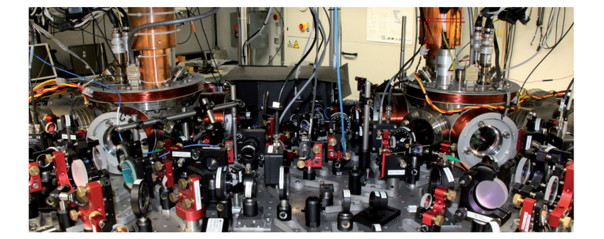 Typischer Aufbau für Ionenfallen für einen Quantencomputer bestehend aus zwei Fallen, Spulen für Magnetfelder und einer Optik zur Steuerung. (Bild: Jürgen Eschner, Universität des Saarlandes)