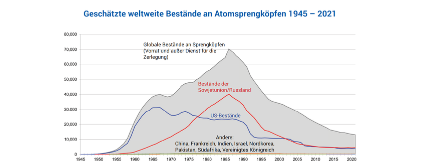 1. Geschätzt wird das Gesamtarsenal auf ca. 13.100 Sprengköpfe im Besitz von Russland (6.257), den USA (5.550), China (350), Frankreich (290), dem Vereinigten Königreich (225), Pakistan (165), Indien (160), Israel (90) und Nordkorea (45). Ca. 3.700 Sprengköpfe gelten als stationiert, die restlichen zählen zur Reserve. https://fas.org/issues/nuclear-weapons/status-world-nuclear-forces/