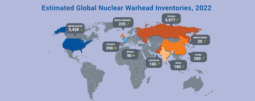 De facto wurden Rüstungskontrollverträge gekündigt (ABM-Vertrag 2003, KSE-Vertrag 2015, INF-Vertrag 2019), die Inspektionen des New-START-Vertrages zwischen den USA und Russland sind unterbrochen und die 10. Überprüfungskonferenz des Nichtverbreitungsvertrags ohne Abschlussdokument beendet. Zudem nimmt die Zahl der einsetzbaren Nuklearwaffen in einigen Staaten weiter zu, so u. a. in Indien, Pakistan, Großbritannien, China und besonders in Nordkorea. Vom russischen Präsident Putin wurde die Möglichkeit eines Einsatzes von taktischen Nuklearwaffen bereits mehrfach ins Spiel gebracht.