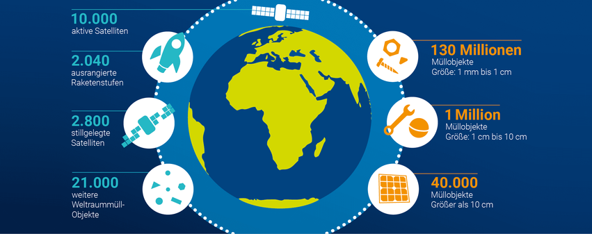 - Die Zahl der Satelliten und Schrottobjekte in diesen Orbits nimmt rapide zu. Derzeit gibt es geschätzt ca. 40.000 Schrottobjekte, die größer als 10 cm sind.