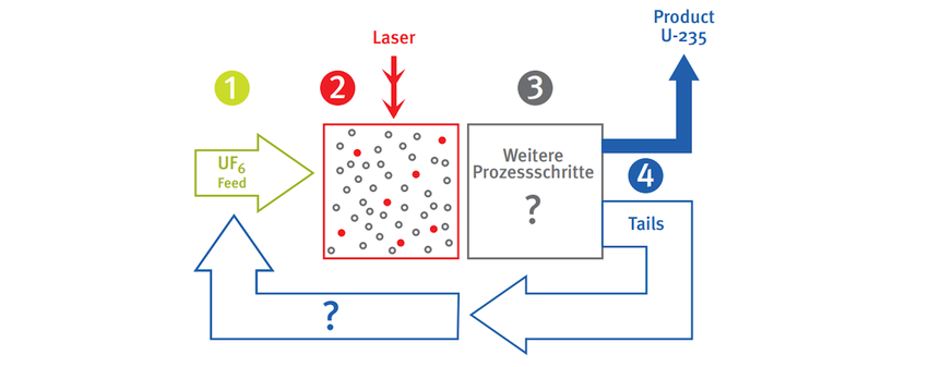 Die Laserabsorption gilt prinzipiell als effizienter als die mechanische Trennung. Als Strahlungsquelle werden Berichten zufolge CO2-Laser verwendet [15, 21] – sie sind vergleichsweise einfache Technik. Da Einzelheiten des Verfahrens der Geheimhaltung unterliegen, ist eine Einschätzung des tatsächlichen Aufwands allerdings schwierig und in Fachkreisen Gegenstand reger Diskussion.
