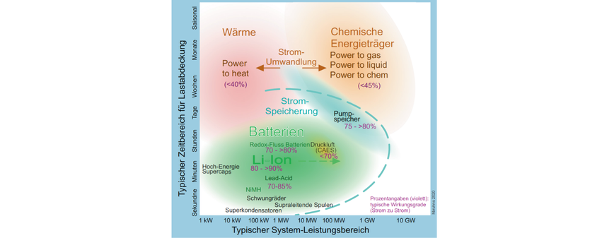 Der Stromanteil am Endenergieverbrauch (Deutschland 2020: ca. 25 % von 2500 TWh/ a1) wird durch erneuerbaren Strom erheblich wachsen. Allerdings schwankt die Erzeugung auf Zeitskalen von Minuten bis hin zu Jahreszeiten: deutsche Windparks liefern in der Jahressumme durchschnittlich nur einen Bruchteil der Nennleistung (20 % onshore, 40 % offshore), Photovoltaik (PV) sogar nur ca. 10 %. Deshalb muss die installierte Wind- und PV-Leistung die zu erwartende Spitzenlast um ein Mehrfaches übersteigen. Um das Netz stabil zu halten und den in wind- bzw. sonnenreichen Lagen und Zeiten produzierten Überschuss-Strom nutzen zu können und zu einem nützlichen Handelsgut zu machen, müssen Lastanpassung an die Stromerzeugung (Sektorenkopplung) und Stromaustausch mit dem Ausland ausgebaut und zusätzlich große Stromspeicher verfügbar werden.