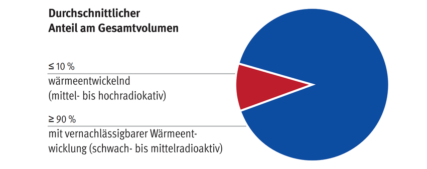 In Deutschland unterteilt man die Abfälle in „wärmeentwickelnde“ und solche „mit vernachlässigbarer Wärmeentwicklung“. Die Unterscheidung hängt mit der geplanten Endlagerung unter Tage zusammen: Während jene „mit vernachlässigbarer Wärmeentwicklung“ das umgebende Gestein um höchstens drei Grad Celsius erwärmen, gilt bei „wärmeentwickelnden“ Abfällen ein Temperaturanstieg um bis zu 200 Grad Celsius als zulässig [4, 5]. Derlei Atommüll macht zwar nur etwa 5 bis 10 Prozent des Abfallvolumens aus, er enthält jedoch rund 99 Prozent der Radioaktivität des gesamten Abfalls [1]. Dazu zählen insbesondere ausgediente Brennelemente [2]. Der hierzulande zwischengelagerte Bestand (etwa 6.000 Tonnen) enthält schätzungsweise 60 bis 70 Tonnen giftiges Plutonium [6]. Dieses ist in feinster Verteilung in der Matrix der einzelnen Brennelemente gebunden.