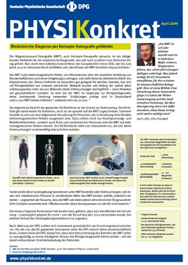 Ausgabe 3 | April 2009 | „Die MRT ist seit Jahrzehnten erprobt und ein in höchstem Maße sicheres Diagnoseverfahren, das schon jetzt strengen Auflagen unterliegt. Nun jedoch erwägt die EU Grenzwerte einzuführen, für die es keinerlei wissenschaftliche Belege gibt. Dies ist reine Willkür. Eine Umsetzung dieser Grenzwerte ginge zu Lasten der Patientenversorgung und der medizinischen Forschung. Die Bundesregierung muss sich dafür einsetzen, dass dieser Irrweg nicht weiter verfolgt wird.“ - Gerd Litfin, DPG-Präsidentmehr...